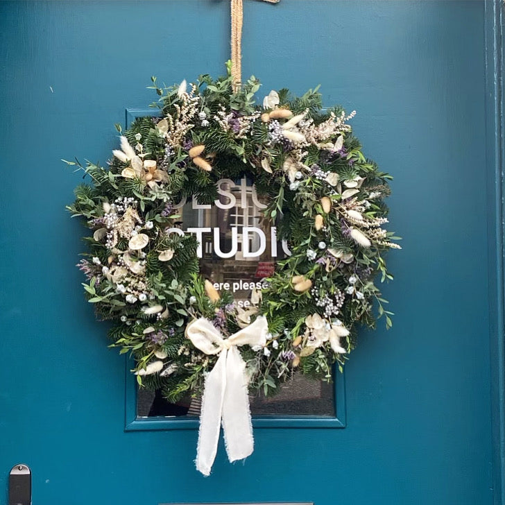 A beautiful real Flower wreath on a Moss base with a selection of adornments such as Berries, Ferns, Citrus Fruits and Pinecones.